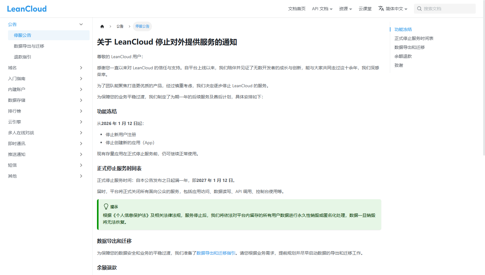 昨天查看 leancloud 后台数据的时候,一条公告映入眼帘:LeanCloud 将于 2027 年 1 月 12 日停止对外提供服务,详情请见关于 LeanCloud 停止对外提供服务的通知 。我靠,这是准备下线服务了!()大伙都知道我之前一直用的 Valine 评论,这个评论系统的 baas 储存服务就在 leancloud,这下预备关服,好玩了..